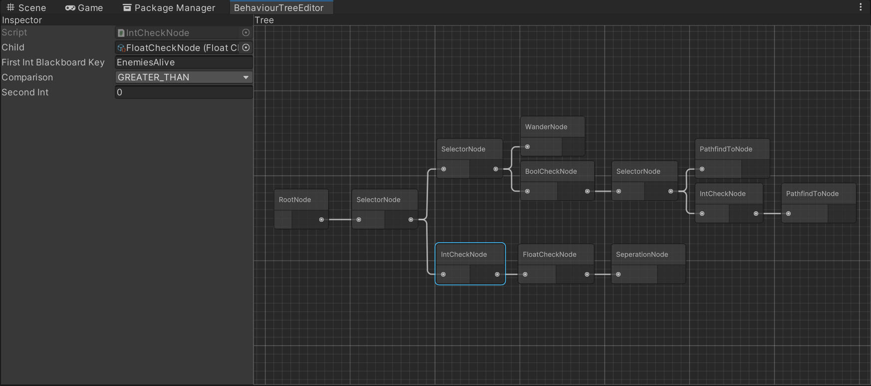 Last year, before the release of Unity's Behaviour Package, I created my own solution for behaviour trees in engine.Implemented using scriptable objects, with CompositeNode, DecoratorNode, and ExecutionNodes that are easily inherited from to provide functionality. Blackboards are also implemented through the IBlackBoard interface, allowing for more user control over data storage.